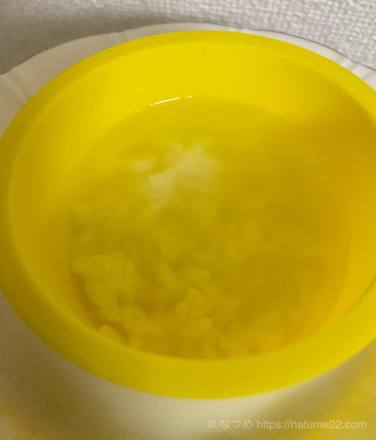 10倍がゆの容器の中には水分(重湯)が沢山残っています。これが炊き上がりの時には熱湯状態なので、非常に熱いです。