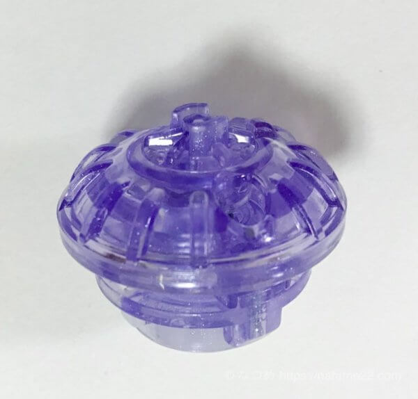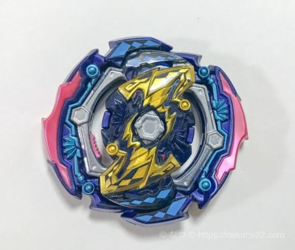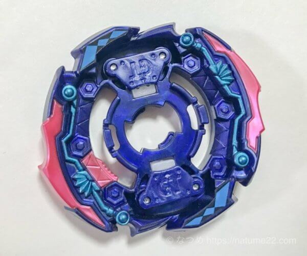 大きなラバー刃(ピンクの部分)が相手ベイに引っ掛かり、自分、相手とも大きく吹き飛ぶ、予測しずらい動きをするバランスタイプのベース